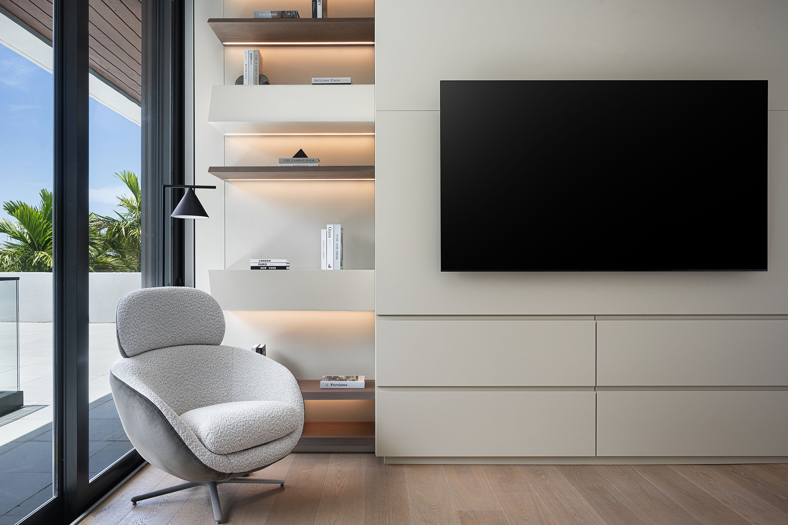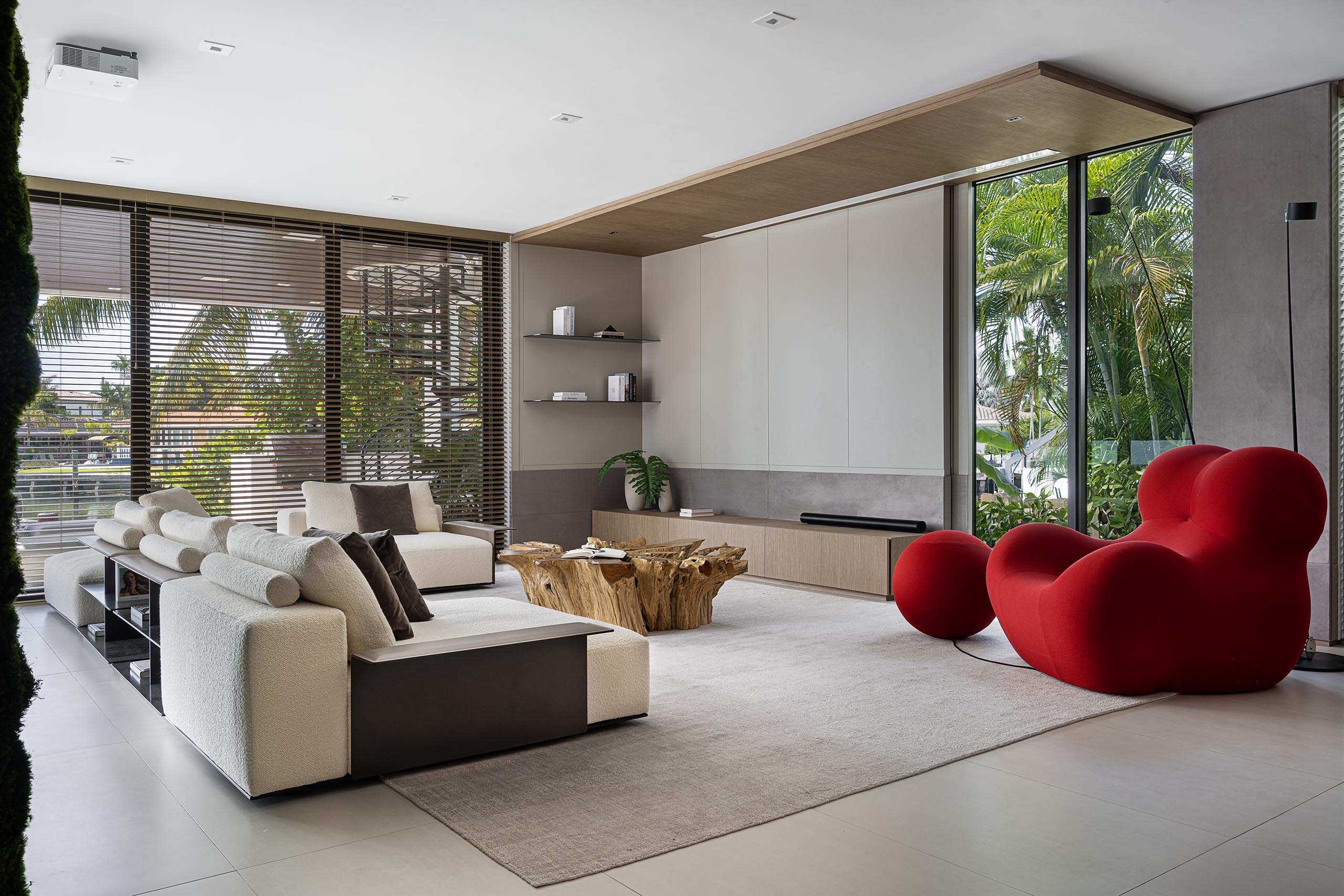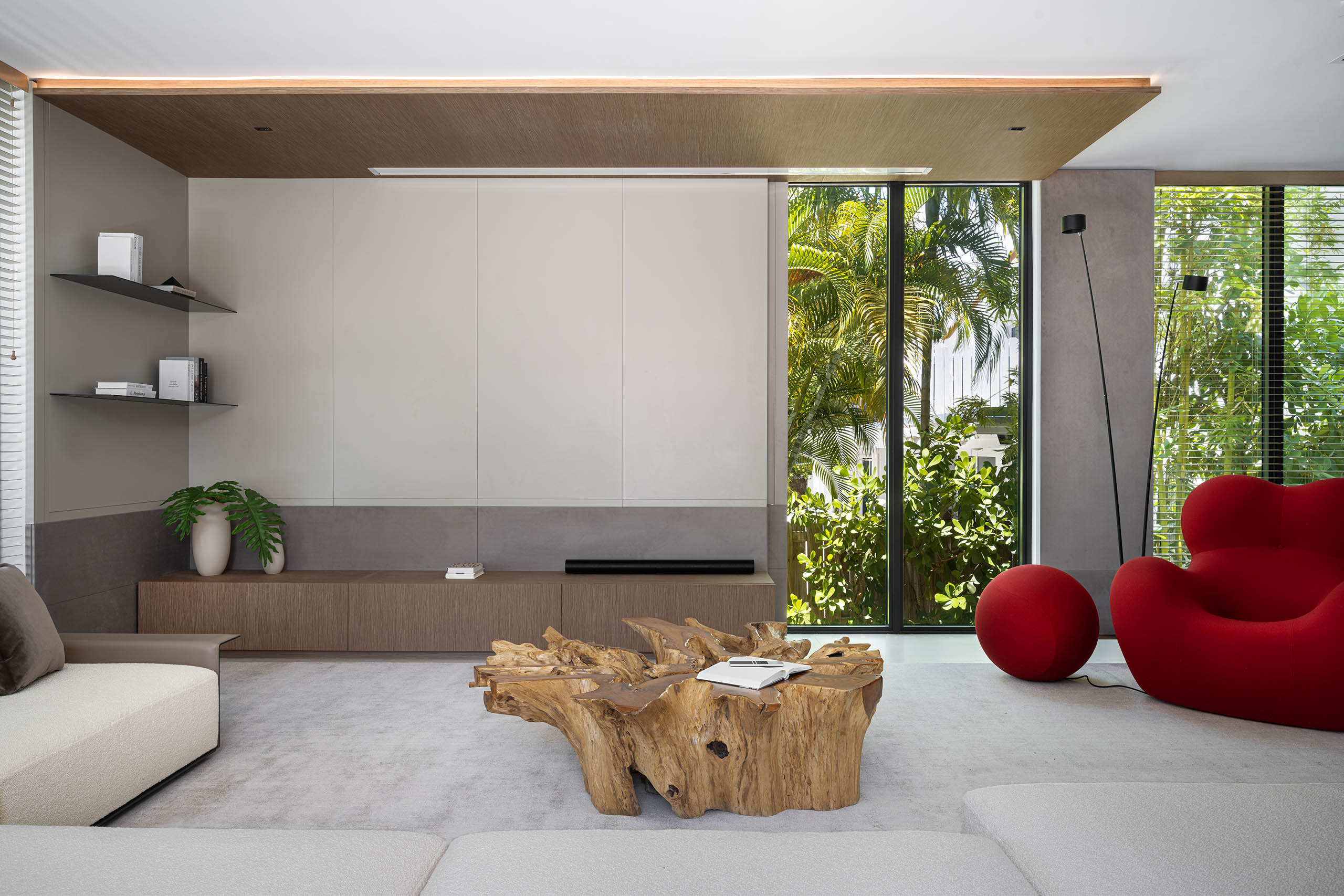 The family room softens the atmosphere without losing rigor. A live moss wall strengthens the visual relationship to the tropical exterior and contributes acoustic softness, while the white bouclé sofa, root coffee table, and sand-toned rugs keep the room grounded in a calmer material register. A custom media unit with a sliding panel was developed to integrate a 140-inch projection screen without sacrificing window openings, allowing the room to shift between lounge, screening space, and informal gathering area while preserving the architectural flow.