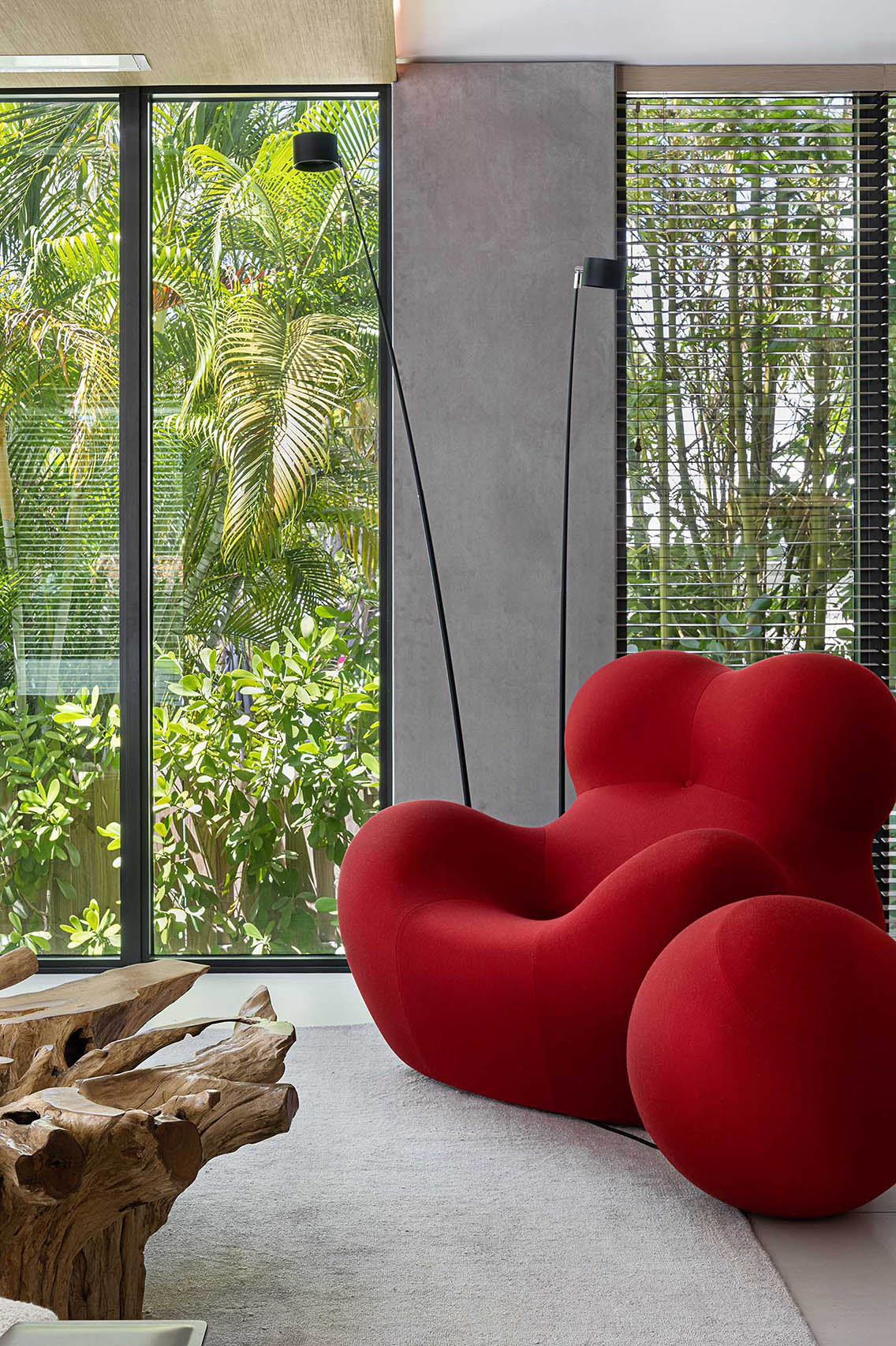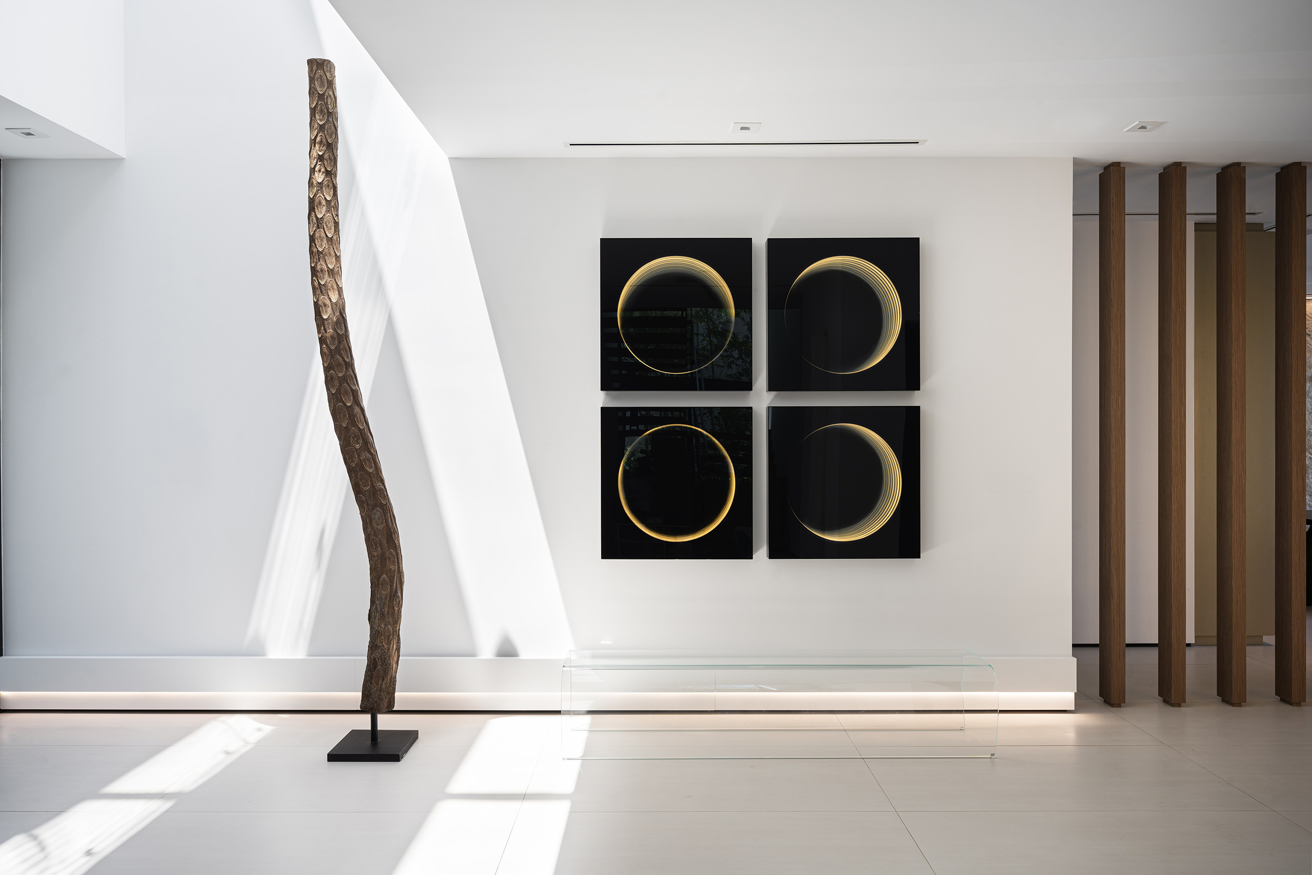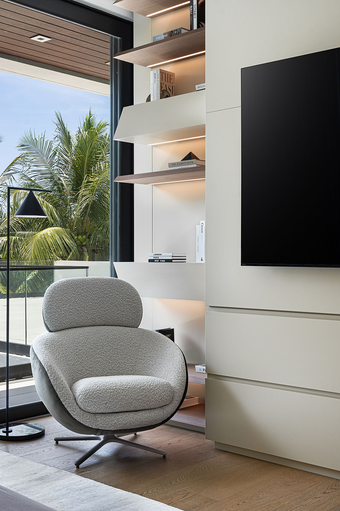The family room softens the atmosphere without losing rigor. A live moss wall strengthens the visual relationship to the tropical exterior and contributes acoustic softness, while the white bouclé sofa, root coffee table, and sand-toned rugs keep the room grounded in a calmer material register. A custom media unit with a sliding panel was developed to integrate a 140-inch projection screen without sacrificing window openings, allowing the room to shift between lounge, screening space, and informal gathering area while preserving the architectural flow.