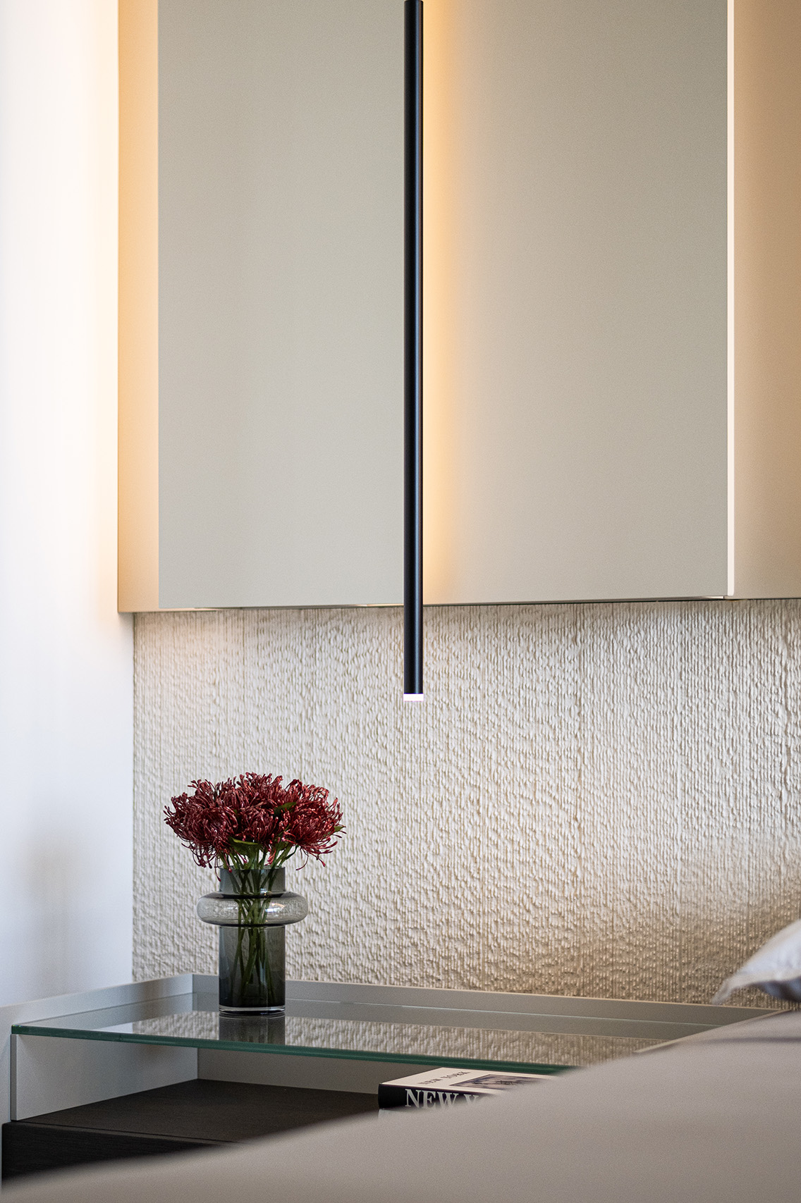 In the primary suite, the language becomes quieter and more restorative. Sand hues, stone cladding, softly illuminated woodwork, open shelving, and a low-profile upholstered bed create a room designed for decompression at the end of demanding workdays. Here, the project avoids spectacle and instead relies on proportion, ambient light, and textural contrast to produce a calm and private atmosphere consistent with the residence’s wider wellness agenda.