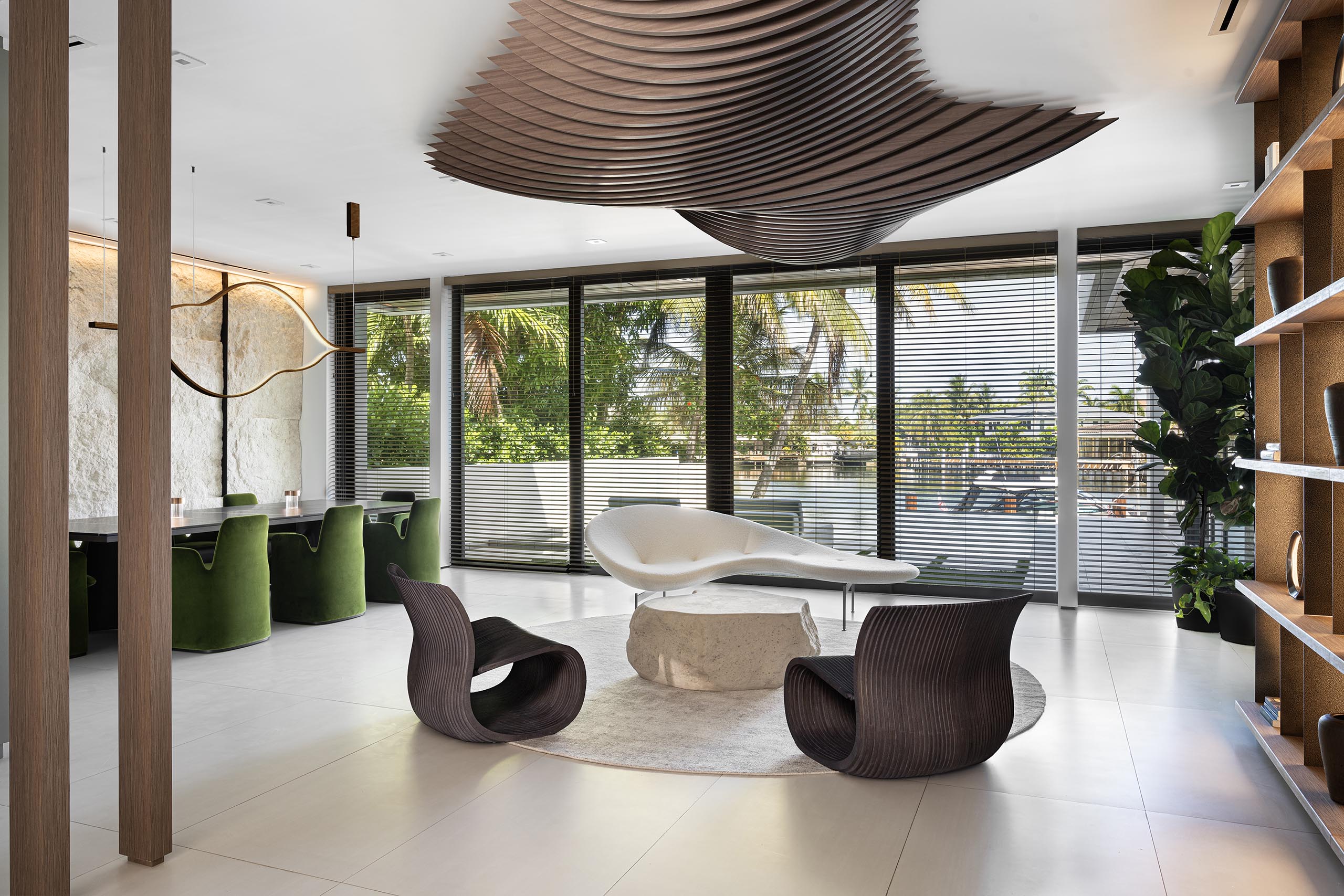 At the center of the residence, the dining room translates geological reference into contemporary interior language. Inspired by cenote caves, the space is anchored by a custom natural-stone wall whose pieces are described in external coverage as weighing roughly 800 kilograms each. That raw tectonic presence is set against the polish of a Sahara Noir marble dining table, forest-green velvet seating, and a metallic wine display, producing a composition that moves between mineral roughness and urban refinement. The result is not simply a dramatic room, but a highly tactile interior in which material contrast becomes the primary design device.